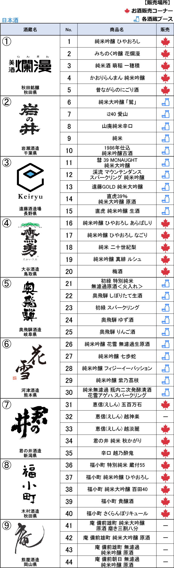 「初心者でも飲みやすいお酒は?」「お刺身に合う日本酒を知りたい」など、気になることを自由に聞いてみてください。開催前までに聞いておけば、当日は作戦通りにお酒を楽しめること間違いなし!下記のリストには載っていない、会場で特別に楽しめるお酒の情報も教えてくれます